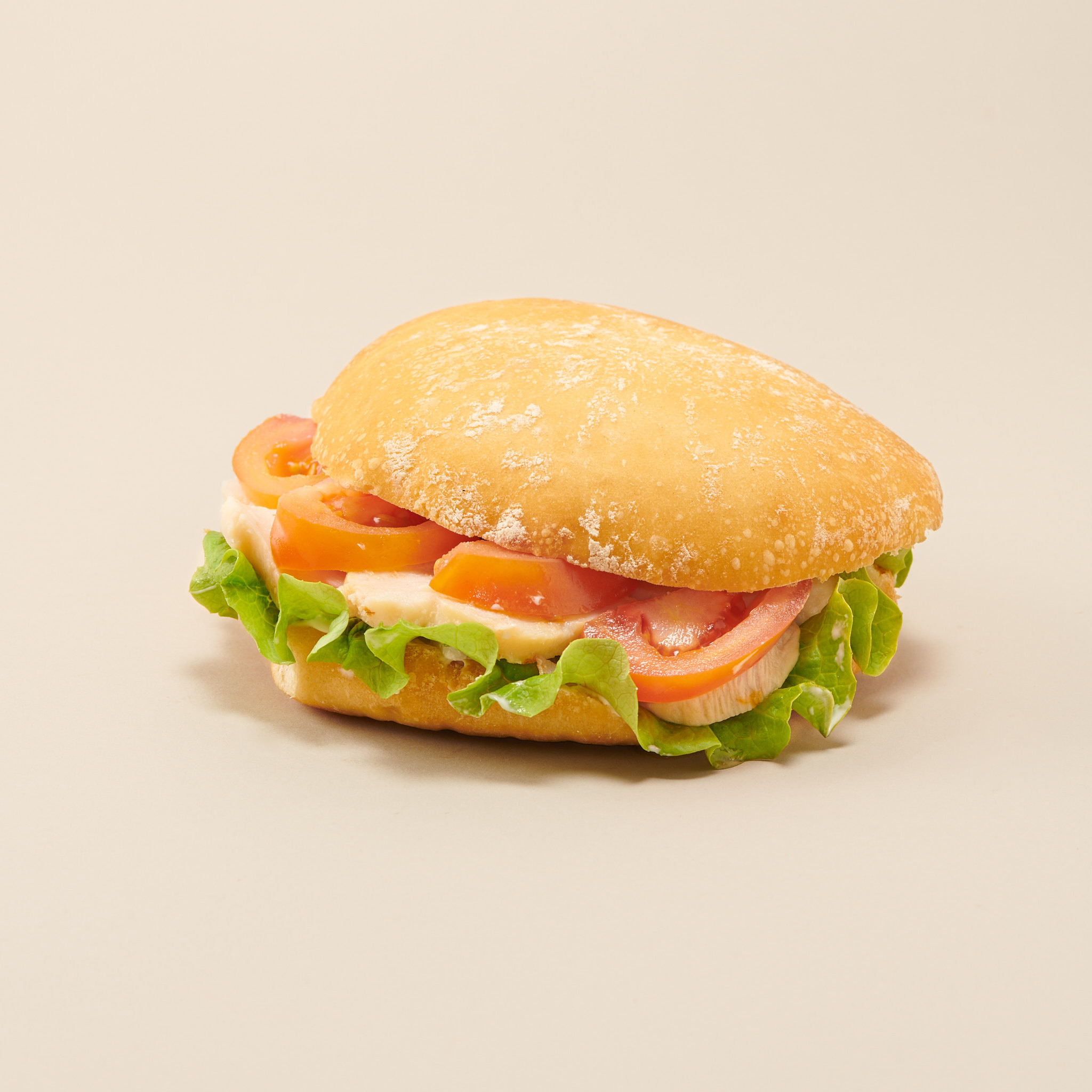 Pain moelleux, mayonnaise, poulet mariné, salade, tomates